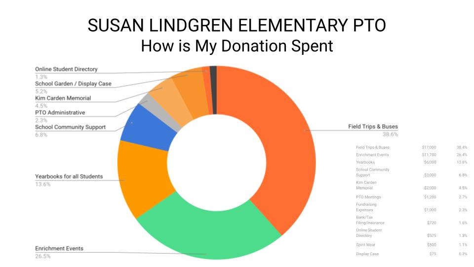 All PTO events are free to attend and are made possible because Susan Lindgren parents find time to contribute and volunteer in a variety of ways. Can you make a donation to help that mission? Contributions of any amount are welcome and are fully tax-deductible.